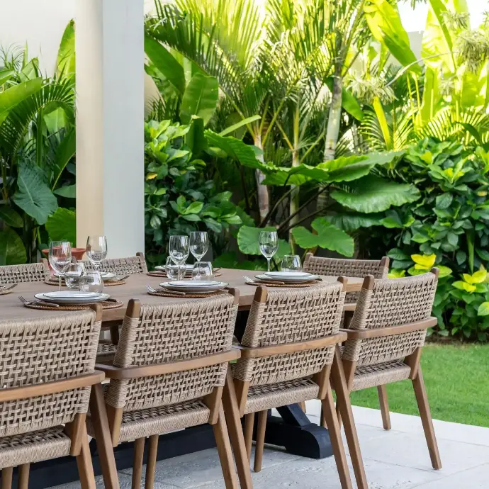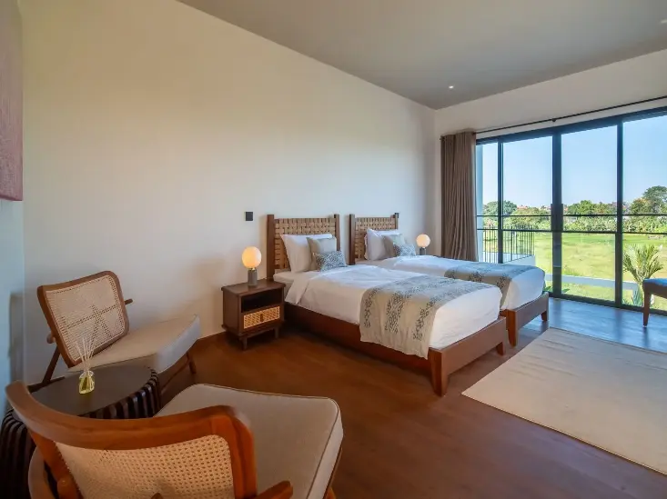 Tucked into a quiet corner of Bali, the villa offers a calm living environment with an emphasis on openness and clean lines. The design leans into neutral tones and natural materials, creating a soft, relaxed mood throughout the home.