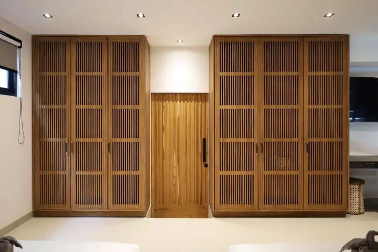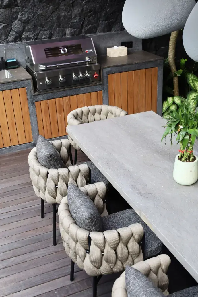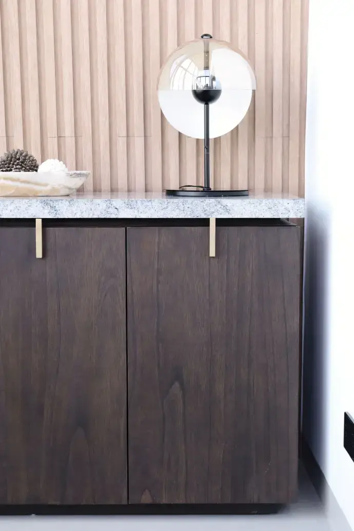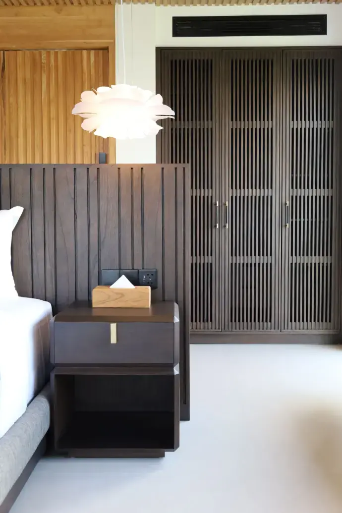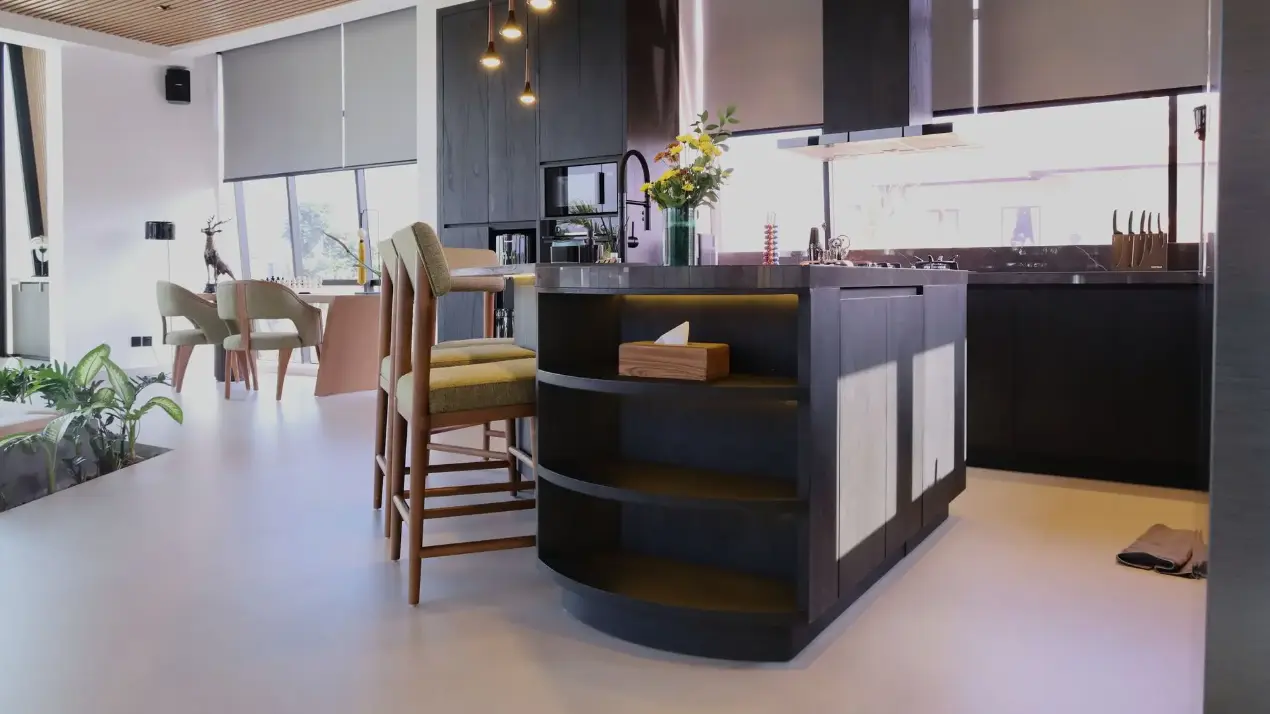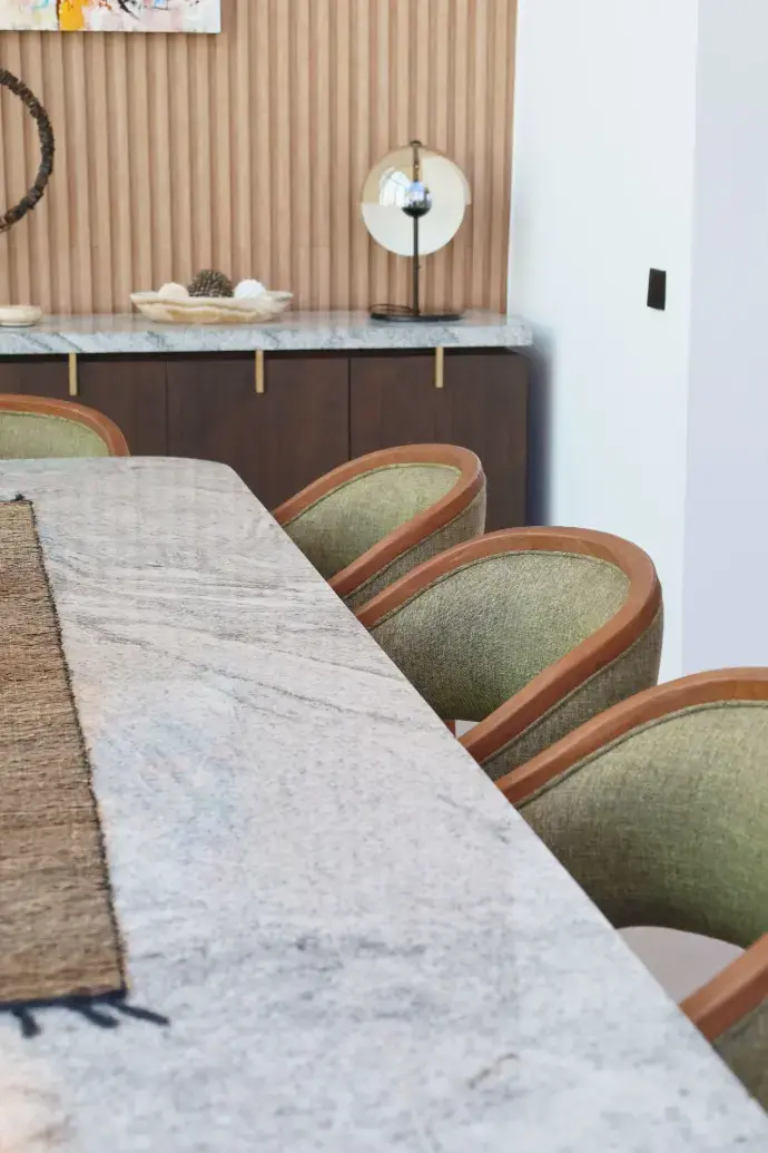 Tabu was entrusted with the full scope of fixed furniture, along with a selection of custom-designed loose pieces — from side tables and chairs to feature dining tables. The overall palette balances dark brown finishes with natural textures, creating a quiet rhythm throughout the home.